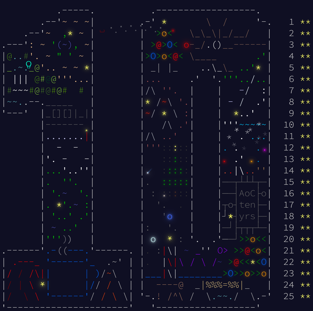 📍 Day 14: Restroom Redoubt - первая часть — симуляция движения нескольких роботов, вторая - найти шаг в симуляции, когда роботы выстраиваются в ascii-изображение ёлки, конкретный пример изображения не даётся (в симуляции несколько тысяч шагов). Можно решить используя системы поиска стеганографии, или просто в предположении, что ствол в ascii будет прямой линией.